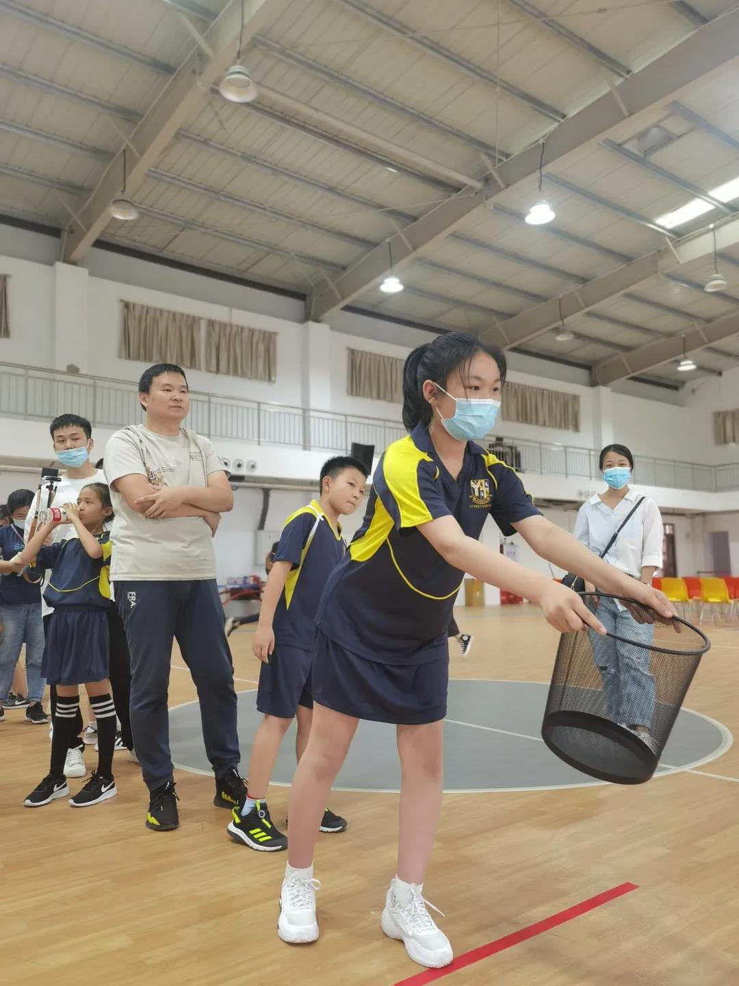 父亲手拿篮筐,孩子站在指定圈内投球,1-3 年级 6 球,5-8 年级 10 球。