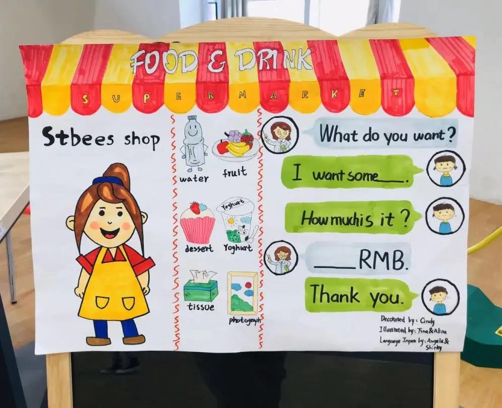 超市有水、纸巾、水果、牛奶、点心,学生可用自己绘制的圣比斯钱币到能量超市购买所需补给。